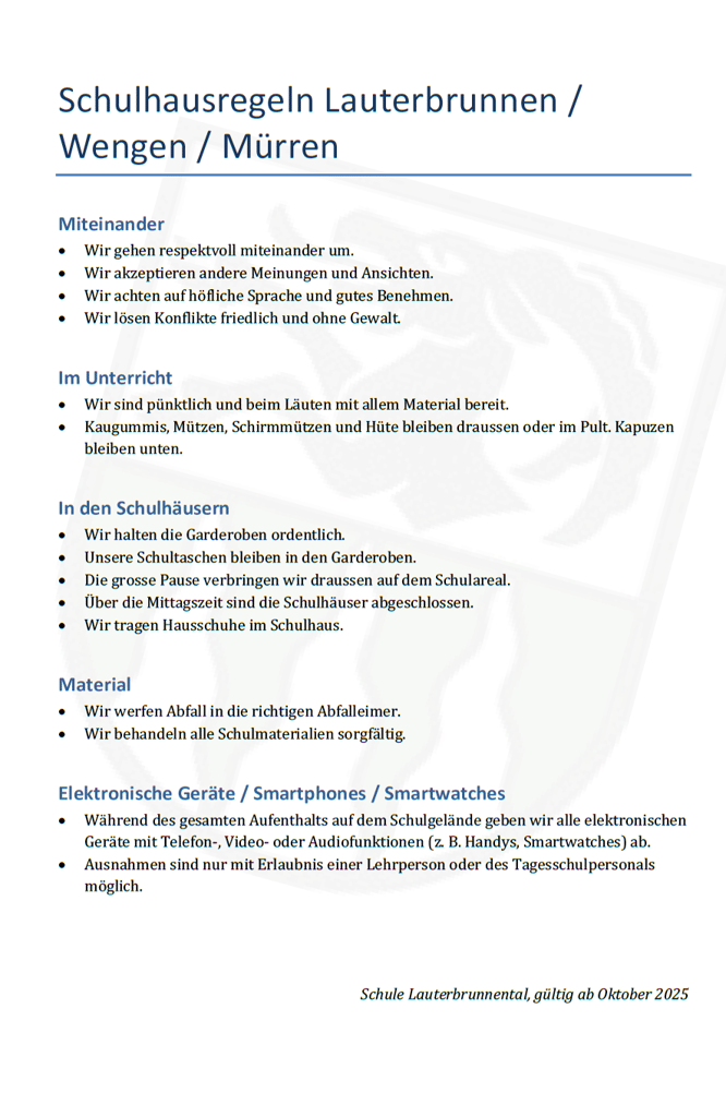 Schulhausregeln Lauterbrunnen, Wengen, Mürren