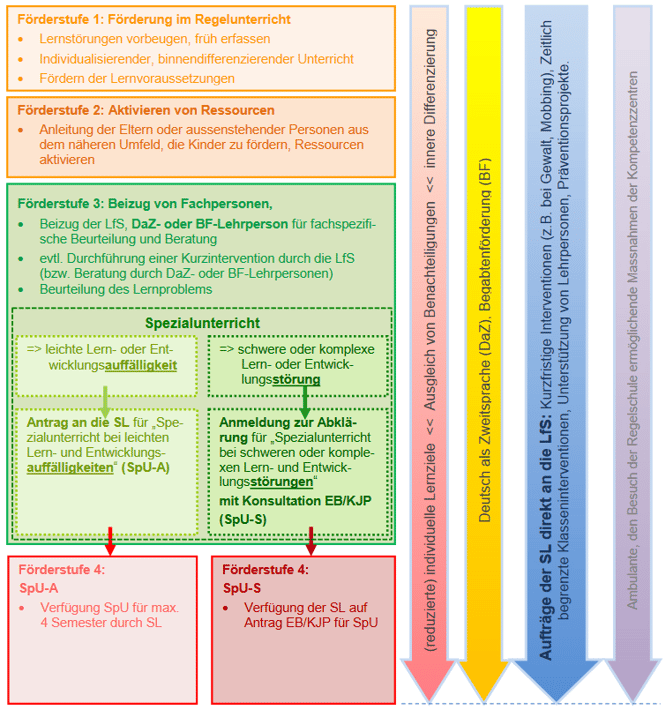 Schülerinnen und Schüler mit besonderem Förder- oder Bildungsbedarf erfahren die angemessene Unterstützung und Förderung zum Erreichen der Grundansprüche gestützt auf das 4-Stufenmodell für die individuelle Förderung von Schülerinnen und Schülern mit besonderem Bedarf der Volksschule des Kantons Bern.